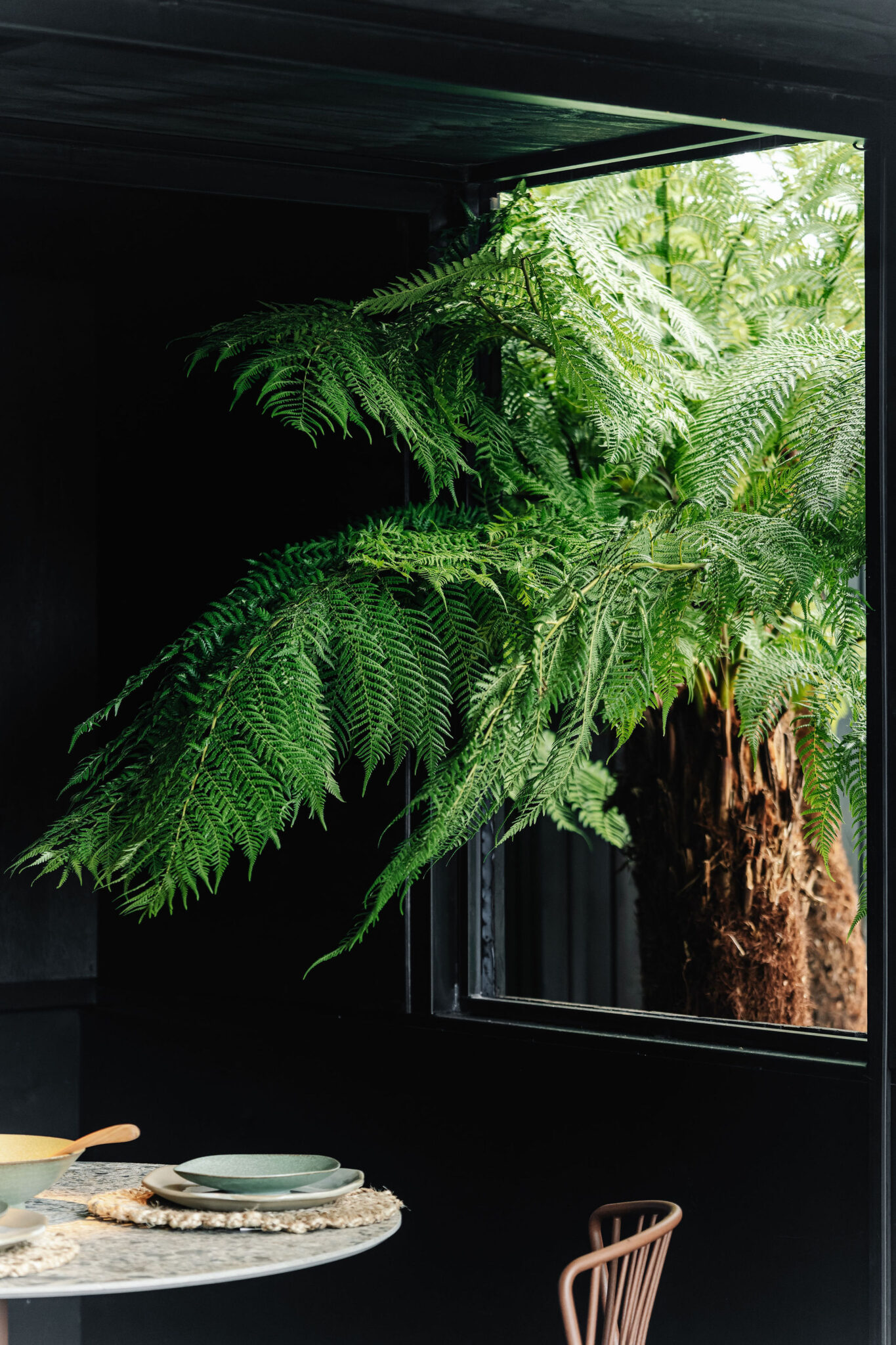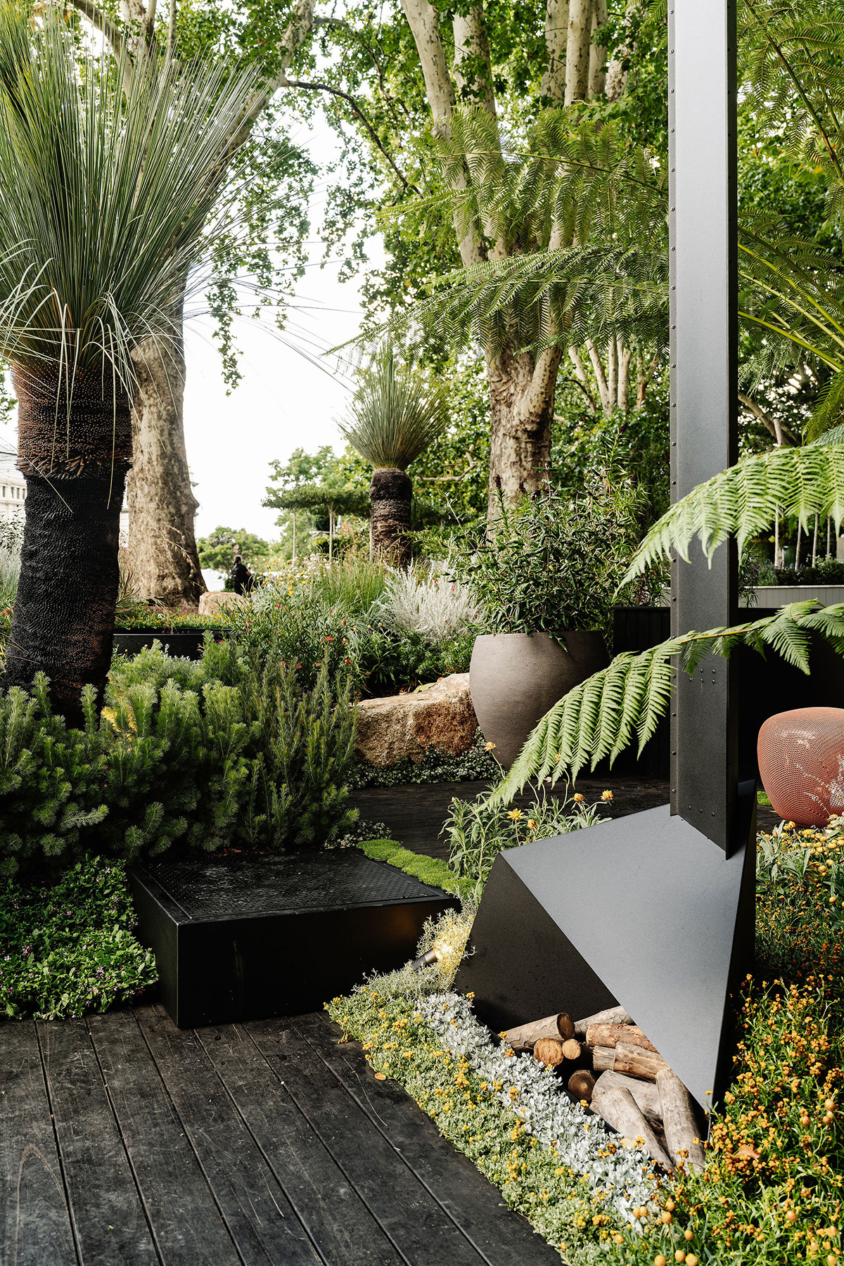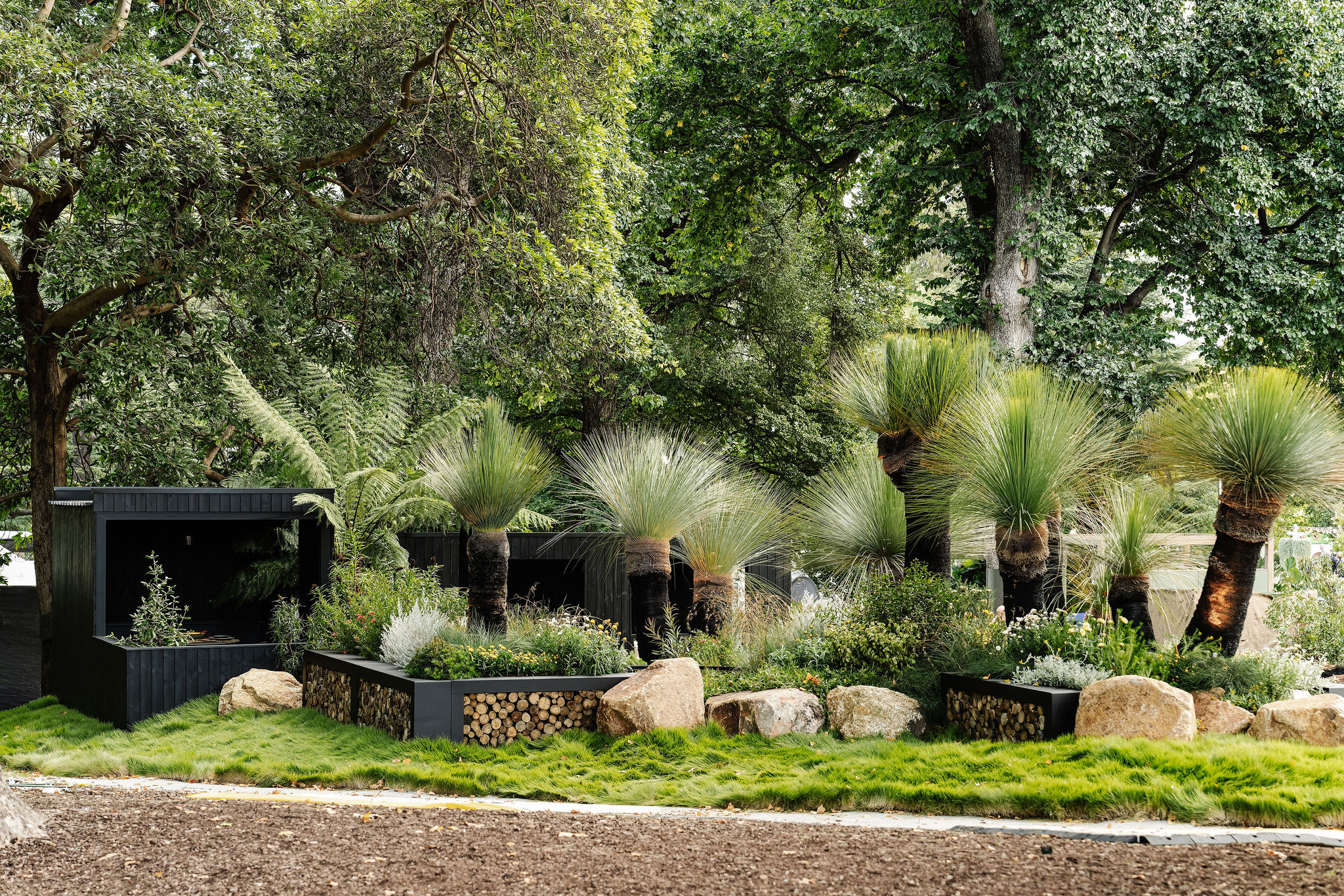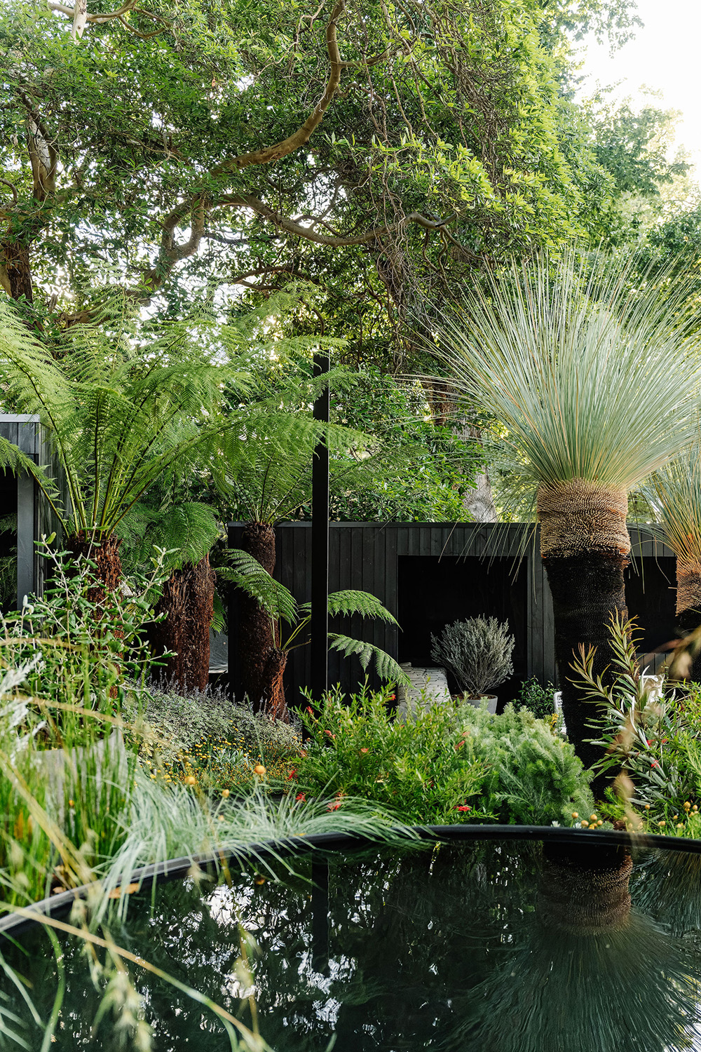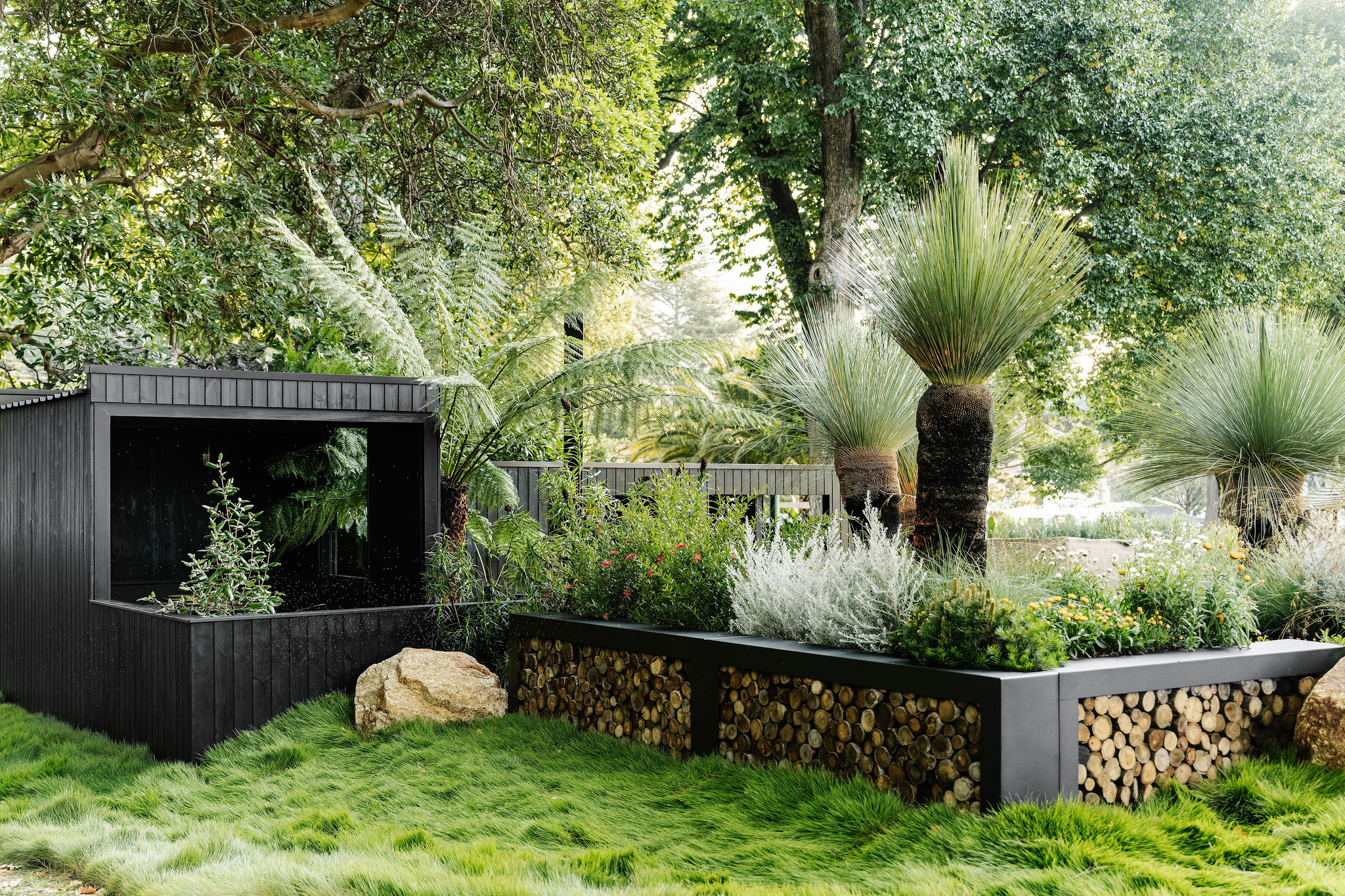 Features include an eco-cabin framed by natives, a perennial meadow, northern garden, southern fernery, firepit, circular wet ledge and eucalyptus canopy anchored by granite outcrops.